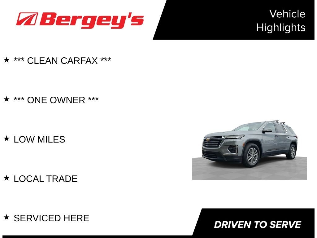 Get ready to rule the road in this sharp and spacious 2023 Chevrolet Traverse LT 1LT, now available at Bergeys Chevrolet in Colmar, PA! With its strong 3.6-L V6 driving an ultra-smooth 9-speed automatic, this three-row powerhouse brings 310 hp of fun and family-friendly versatility. Whether youre cruising through Montgomery County or loading up the crew for a big weekend, the Traverse LT has you coveredtech-savvy cabin, comfortable seats, and style to spare. Head to Bergeys Chevrolet in Colmar today and take this big-SUV for a spinyour next adventure is ready!