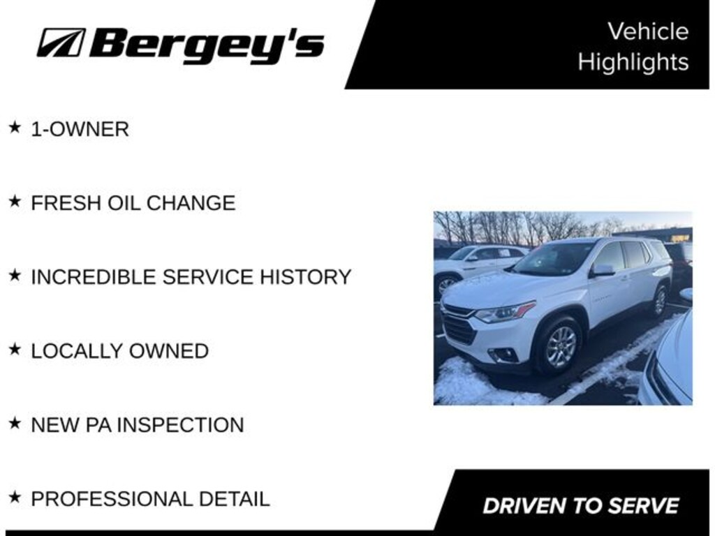 Summit White 2019 Chevrolet Traverse LT Cloth w/1LT AWD 9-Speed Automatic 3.6L V6 SIDI VVT 1-OWNER, FRESH OIL CHANGE, INCREDIBLE SERVICE HISTORY, LOCALLY OWNED, NEW PA INSPECTION, PROFESSIONAL DETAIL, AWD.