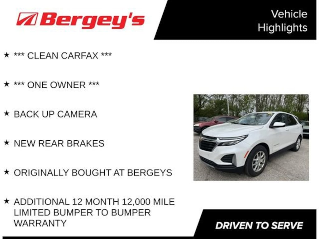 Recent Arrival! *** CLEAN CARFAX ***, *** ONE OWNER ***, BACK UP CAMERA, NEW REAR BRAKES, ORIGINALLY BOUGHT AT BERGEYS, ADDITIONAL 12 MONTH 12,000 MILE LIMITED BUMPER TO BUMPER WARRANTY. Certified. Certification Program Details: *12-Month/12,000-Mile Bumper-to-Bumper Limited Warranty*, whichever comes first, in addition to any remaining original factory Bumper-to-Bumper warranty. See participating dealer and warranty booklet for limited warranty eligibility and coverage details, including limitations and exclusions. *Except for non-GM vehicles in the State of California, where coverage will be provided by a vehicle service contract.26/31 City/Highway MPG2023 Iridescent Pearl Tricoat Chevrolet Equinox FWD 1.5L DOHC 6-Speed Automatic Electronic with Overdrive