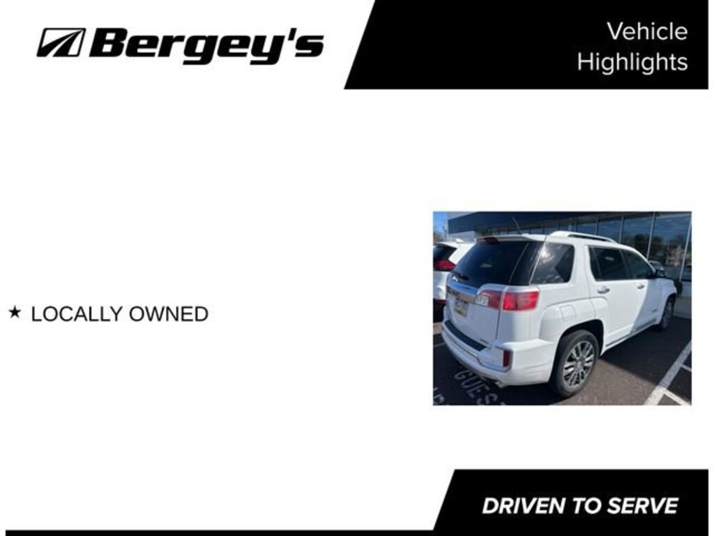 Discover the exceptional 2016 GMC Terrain Denali, a premium SUV that seamlessly blends style, performance, and convenience. With its striking white exterior and a host of advanced features, this Terrain Denali is the embodiment of refined sophistication.- Locally Owned- Sunroof, Power and Tilt-Sliding with Express-Open and Wind Deflector- 3.6L V6 Engine with VVT (Variable Valve Timing), Producing 301 hp and 272 lb-ft of Torque- 19 Denali-Specific Alloy Wheels- Color Touch Navigation with IntelliLink, AM/FM SiriusXM Stereo with MP3 Playback, and 7 Diagonal Touch-Screen DisplayThis Terrain Denali is equipped to elevate your driving experience. The powerful 3.6L V6 engine, paired with an efficient 6-speed automatic transmission and all-wheel drive, delivers a responsive and confident performance, whether you're navigating city streets or exploring the open road.Inside, the Terrain Denali offers a premium, well-appointed cabin that caters to your every need. Luxurious perforated leather-appointed seats, heated for both the driver and front passenger, provide exceptional comfort. The 8-way power-adjustable driver and passenger seats, along with the memory function, allow you to find your perfect driving position with ease.The advanced technology features of the Terrain Denali further enhance your driving experience. The Color Touch Navigation system with IntelliLink seamlessly integrates your smartphone, providing turn-by-turn directions, hands-free calling, and access to your favorite music. The Bose premium audio system, with 8 strategically placed speakers, delivers a truly immersive listening experience.Safety is also a top priority in the Terrain Denali. Features like Forward Collision Alert, Lane Departure Warning, and Rear Cross-Traffic Alert help you stay aware of your surroundings and respond quickly to potential hazards. The rear-view camera and rear parking sensors make maneuvering in tight spaces a breeze.With its impressive combination of power, technology, and premium amenities, the 2016 GMC Terrain Denali is a standout in the SUV segment. Experience the exceptional craftsmanship and attention to detail that sets this Terrain Denali apart. Visit our showroom today and let us demonstrate how this exceptional vehicle can elevate your driving experience.