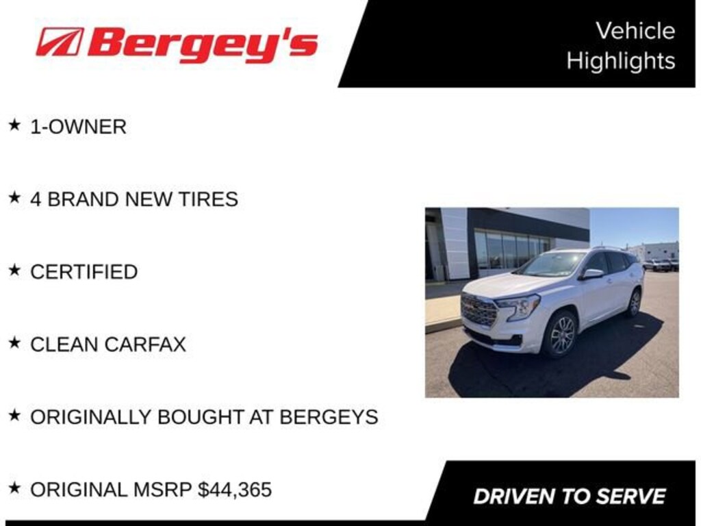 Certified Vehicle!This 2023 GMC Terrain Denali is a remarkable SUV that combines sophisticated style, advanced technology, and exceptional performance. Boasting a sleek White Frost Tricoat exterior and a well-appointed Denali Premium interior, this Terrain is a true standout in its class.- 1-Owner- 4 Brand New Tires- Clean CARFAX- Original MSRP $44,365- Sunroof, Skyscape Power with Power Sunscreen- Denali Premium Package- Floor Liner Package (LPO)The Terrain Denali's 1.5L DOHC engine, paired with a smooth 9-speed automatic transmission and all-wheel drive, delivers an impressive balance of power and efficiency, with an EPA-estimated 24 city/28 highway MPG.Inside, the premium Bose sound system, wireless Apple CarPlay/Android Auto, and integrated navigation system provide a truly connected driving experience. The heated and ventilated front seats, heated rear outboard seats, and heated steering wheel ensure exceptional comfort no matter the weather.Advanced safety features, including Adaptive Cruise Control, Lane Departure Warning, and Automatic Parking Assist, give you peace of mind on every journey. The Terrain Denali's spacious, flexible cargo area and premium materials throughout the cabin make it an exceptional choice for both daily commutes and weekend adventures.Certified Vehicle! This Terrain Denali has been meticulously inspected and reconditioned to meet our rigorous standards, giving you the confidence of owning a like-new vehicle with the protection of a comprehensive warranty.Experience the refined capability and premium amenities of the 2023 GMC Terrain Denali. Schedule a test drive today and discover why this exceptional SUV should be your next automotive companion.