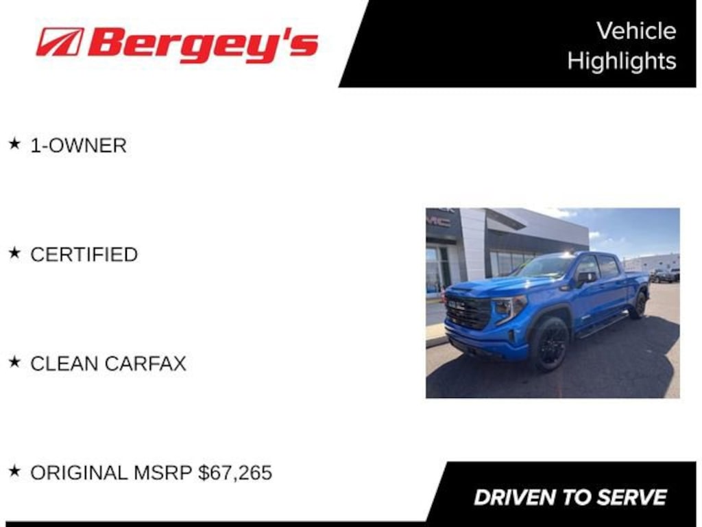 Certified Vehicle!This 2024 GMC Sierra 1500 Elevation is a standout in its class, boasting an impressive array of premium features that elevate the driving experience. Highlights include:- 1-OWNER- CERTIFIED- CLEAN CARFAX- ORIGINAL MSRP $67,265- Elevation Premium Package- Elevation Black Package (LPO)- High Capacity Suspension Package- Sierra Safety Plus Package- Up-Level Rear Seat w/Storage PackageThis Sierra 1500 Elevation is powered by a robust EcoTec3 5.3L V8 engine, delivering 355 horsepower and 383 lb-ft of torque, mated to a smooth-shifting 10-speed automatic transmission. With its 4WD capabilities, this truck is ready to tackle any terrain with confidence, whether you're hauling heavy loads or embarking on off-road adventures.The dynamic blue metallic exterior exudes a bold and sophisticated presence, while the spacious and well-appointed interior offers exceptional comfort and convenience. Indulge in the premium Bose 7-speaker sound system, wireless charging, and the advanced GMC Infotainment system with navigation, seamlessly integrating your digital life on the go.Certified Vehicle!This 2024 GMC Sierra 1500 Elevation has been meticulously inspected and certified, ensuring you can drive with confidence knowing it's in exceptional condition. With low mileage and a clean CARFAX report, this truck represents an outstanding value proposition.Experience the power, capability, and refined luxury of the 2024 GMC Sierra 1500 Elevation. Schedule a test drive today and discover why this truck should be your next automotive companion.