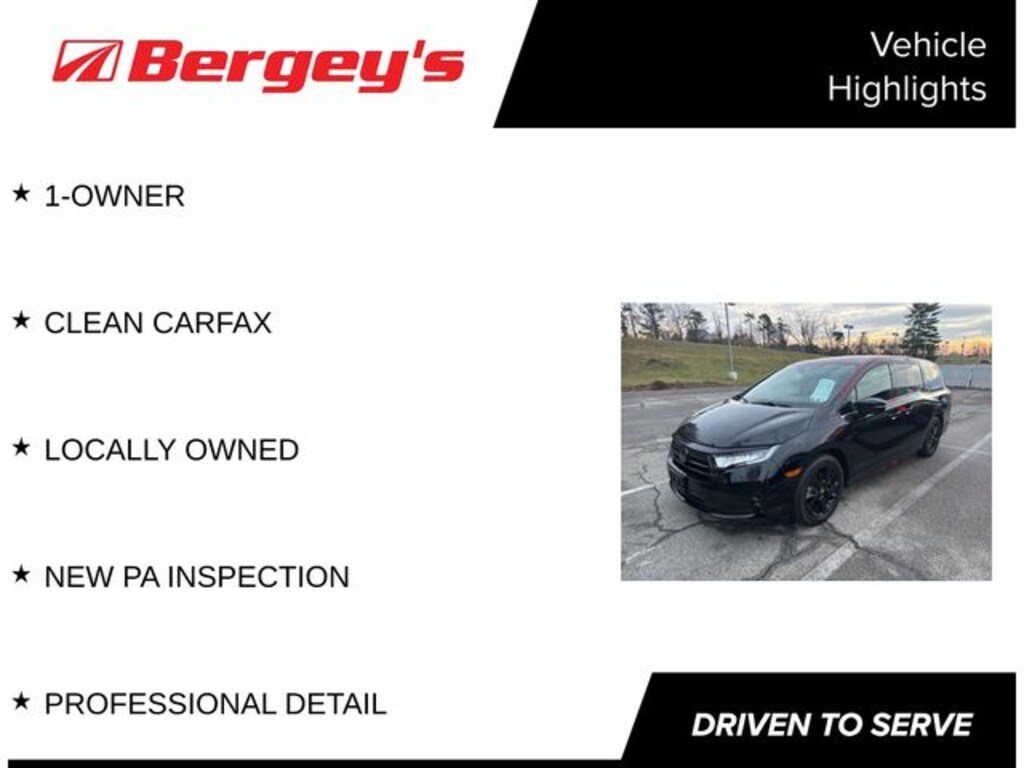 3.61 Axle Ratio, 3rd row seats: split-bench, 4-Wheel Disc Brakes, 7 Speakers, A/V remote: CabinControl, ABS brakes, Adaptive Cruise Control: Adaptive Cruise Control (ACC) with Low-Speed Follow, Air Conditioning, Alloy wheels, AM/FM radio: SiriusXM, Anti-whiplash front head restraints, Apple CarPlay/Android Auto, Auto High-beam Headlights, Auto-dimming Rear-View mirror, Automatic temperature control, Blind Spot Information (BSI) System warning, Brake assist, Bumpers: body-color, Delay-off headlights, Driver door bin, Driver vanity mirror, Driver's Seat Mounted Armrest, Dual front impact airbags, Dual front side impact airbags, Electronic Stability Control, Exterior Parking Camera Rear, Four wheel independent suspension, Front anti-roll bar, Front Bucket Seats, Front dual zone A/C, Front fog lights, Front reading lights, Fully automatic headlights, Garage door transmitter: HomeLink, Heated door mirrors, Heated Front Bucket Seats, Heated front seats, Illuminated entry, Knee airbag, Lane departure: Lane Keeping Assist System (LKAS) active, Leather Seat Trim, Leather steering wheel, Low tire pressure warning, Memory seat, Occupant sensing airbag, Outside temperature display, Overhead airbag, Overhead console, Panic alarm, Passenger door bin, Passenger seat mounted armrest, Passenger vanity mirror, Power door mirrors, Power driver seat, Power Liftgate, Power moonroof, Power passenger seat, Power steering, Power windows, Radio data system, Radio: 160-Watt AM/FM/HD/SiriusXM Audio System, Rear air conditioning, Rear anti-roll bar, Rear reading lights, Rear seat center armrest, Rear window defroster, Rear window wiper, Reclining 3rd row seat, Remote keyless entry, Security system, Speed control, Speed-sensing steering, Speed-Sensitive Wipers, Split folding rear seat, Spoiler, Steering wheel mounted audio controls, Tachometer, Telescoping steering wheel, Tilt steering wheel, Traction control, Trip computer, Turn signal indicator mirrors, Variably intermittent wipers, Wheels: 19" Gloss Black Alloy. Clean CARFAX. CARFAX One-Owner. Maroon 2024 Honda Odyssey Sport FWD 10-Speed Automatic 3.5L V6 SOHC i-VTEC 24V