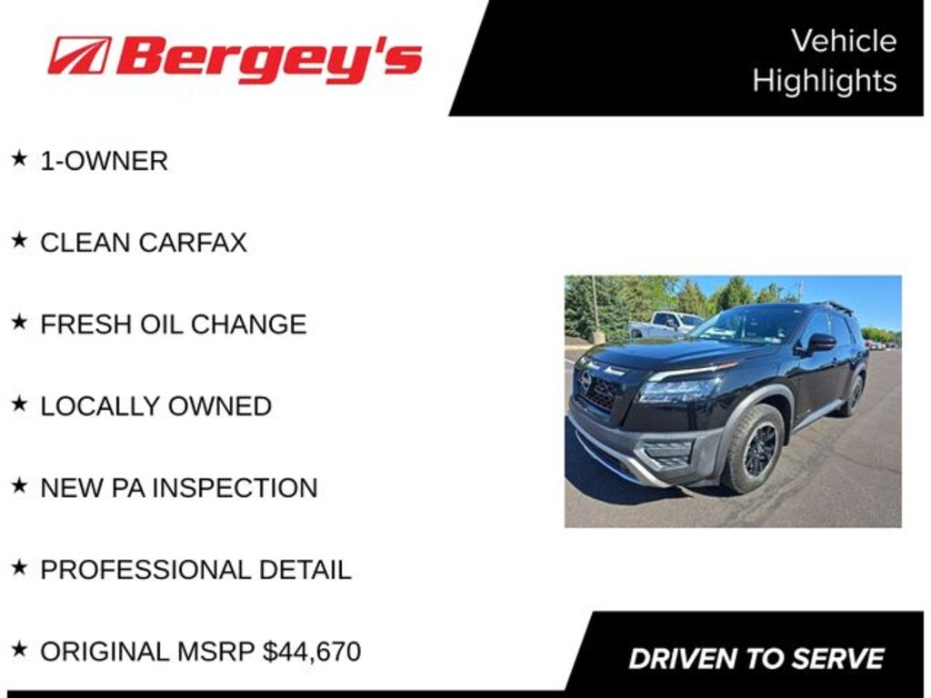 JUST TRADED!! 1-OWNER, CLEAN CARFAX, FRESH OIL CHANGE, LOCALLY OWNED, NEW PA INSPECTION, PROFESSIONAL DETAIL, ORIGINAL MSRP $44,670, 4WD 3rd row seats: bench, 4-Wheel Disc Brakes, 6 Speakers, ABS brakes, Air Conditioning, Alloy wheels, AM/FM radio: SiriusXM, Auto High-beam Headlights, Automatic temperature control, Axle Ratio: 4.334, Black Splash Guards (Set of 4), Brake assist, Delay-off headlights, Driver door bin, Driver vanity mirror, Dual front impact airbags, Dual front side impact airbags, Electronic Stability Control, Emergency communication system: NissanConnect Services, Four wheel independent suspension, Front anti-roll bar, Front Bucket Seats, Front Center Armrest, Front dual zone A/C, Front fog lights, Front reading lights, Fully automatic headlights, Heated door mirrors, Heated Front Bucket Seats, Heated front seats, Illuminated entry, Knee airbag, Leather steering wheel, Leatherette Seating Surfaces, Low tire pressure warning, NissanConnect featuring Apple CarPlay and Android Auto, Occupant sensing airbag, Outside temperature display, Overhead airbag, Overhead console, Panic alarm, Passenger door bin, Passenger vanity mirror, Power door mirrors, Power driver seat, Power steering, Power windows, Radio data system, Radio: AM/FM Audio System w/NissanConnect, Rear air conditioning, Rear anti-roll bar, Rear Parking Sensors, Rear reading lights, Rear side impact airbag, Rear window defroster, Rear window wiper, Reclining 3rd row seat, Remote keyless entry, Rock Creek AS Floor Liners & Cargo Area Protector, Roof rack, Security system, Speed control, Speed-sensing steering, Split folding rear seat, Spoiler, Steering wheel mounted audio controls, Tachometer, Telescoping steering wheel, Tilt steering wheel, Traction control, Trip computer, Turn signal indicator mirrors, Variably intermittent wipers, Wheels: 18" Beadlock Styled Design, Clean CARFAX. CARFAX One-Owner. Super Black 2023 Nissan Pathfinder Rock Creek 4WD 9-Speed Automatic V6